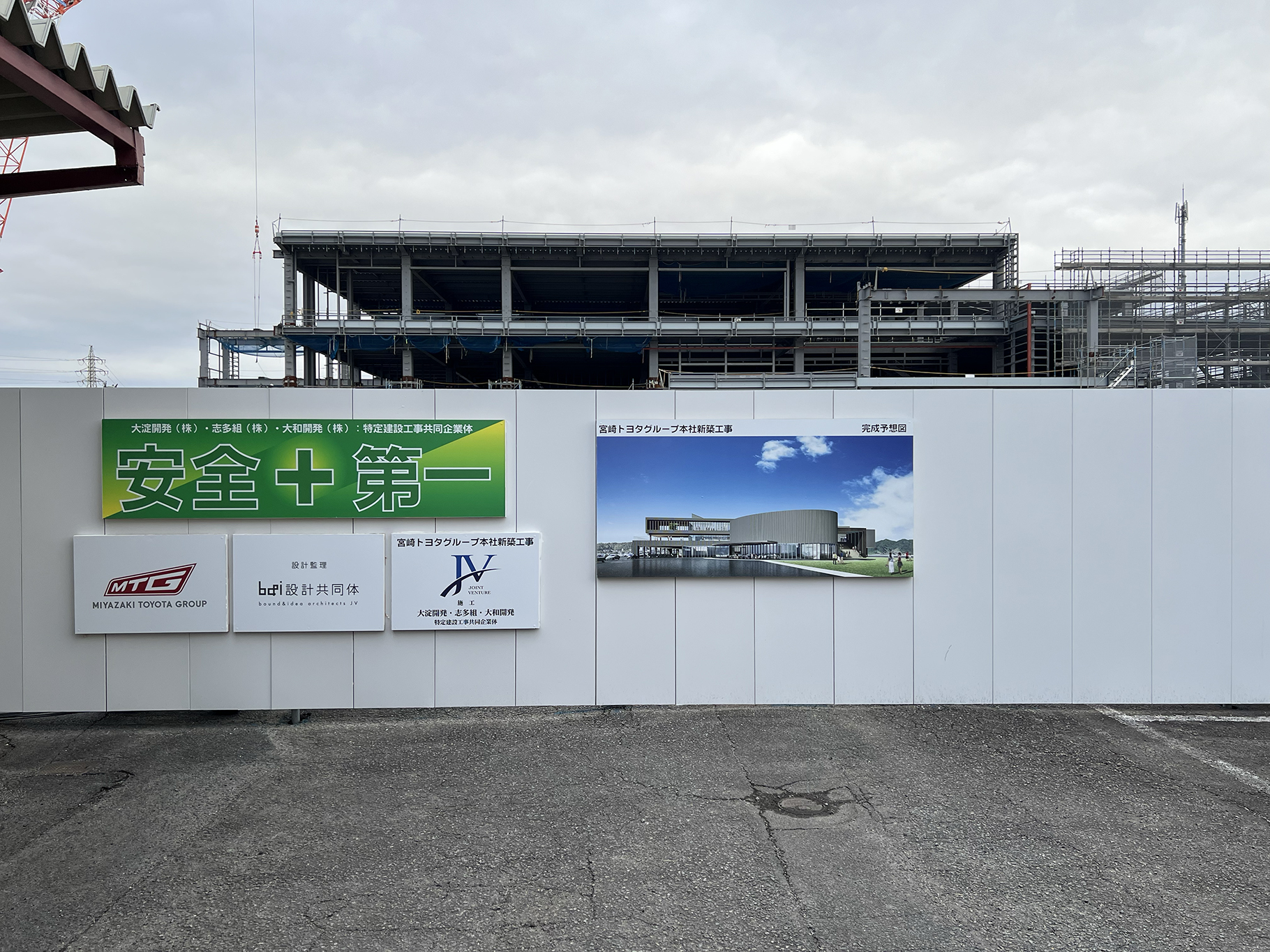 宮崎トヨタグループ本社【 MTHD 】宮崎市で建築中の鉄骨造地上3階建て、事務所+自動車販売店+自動車整備工場です。